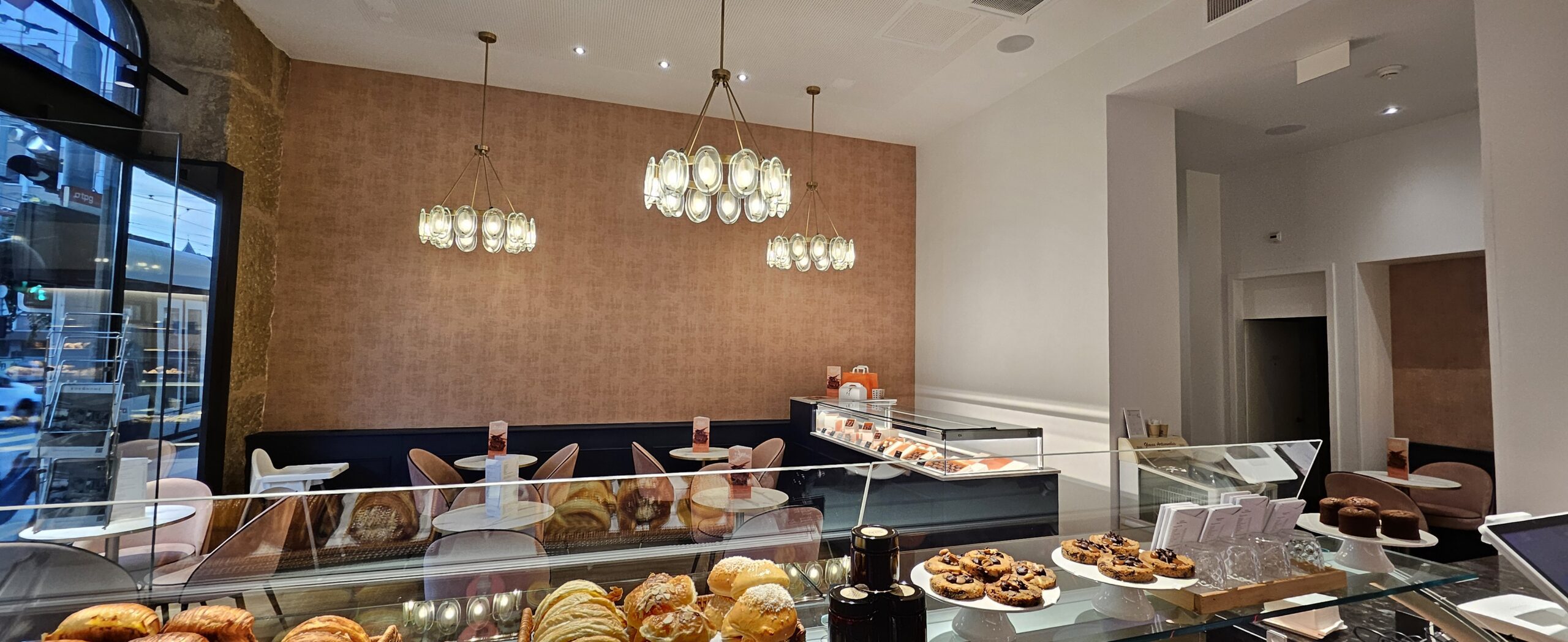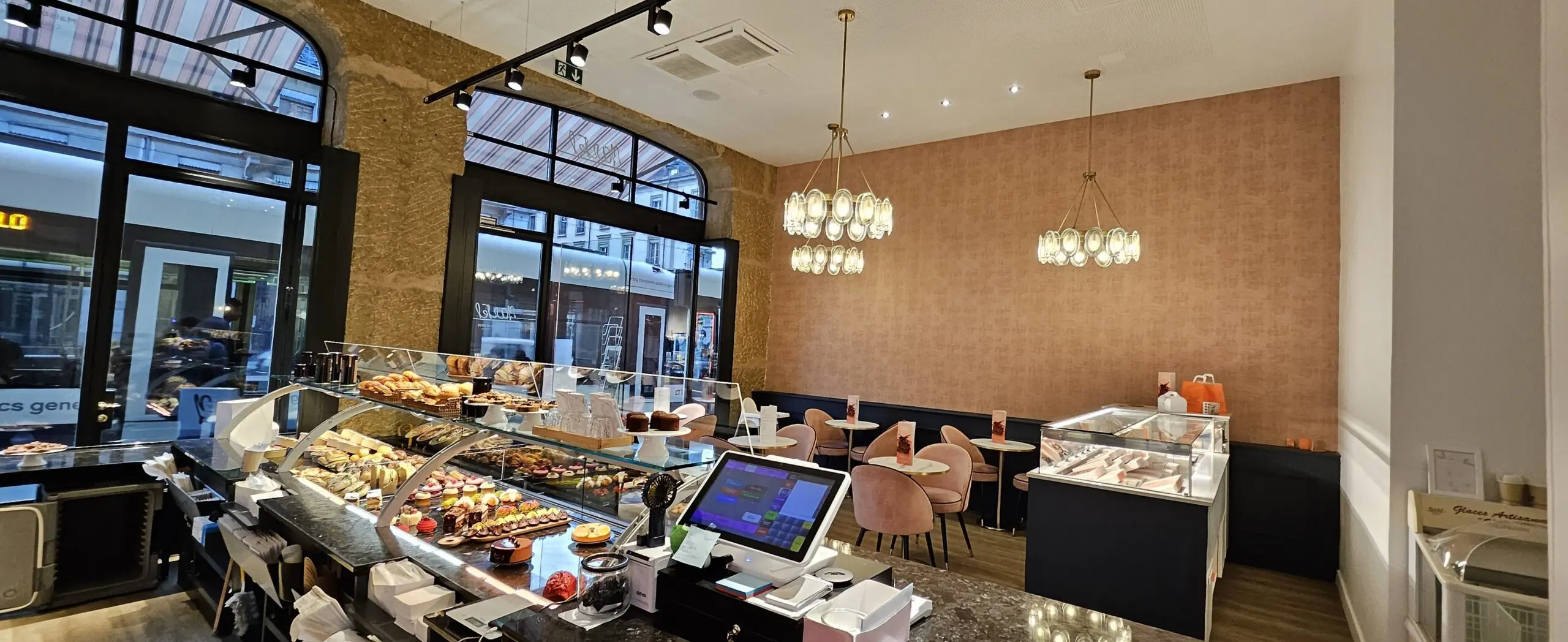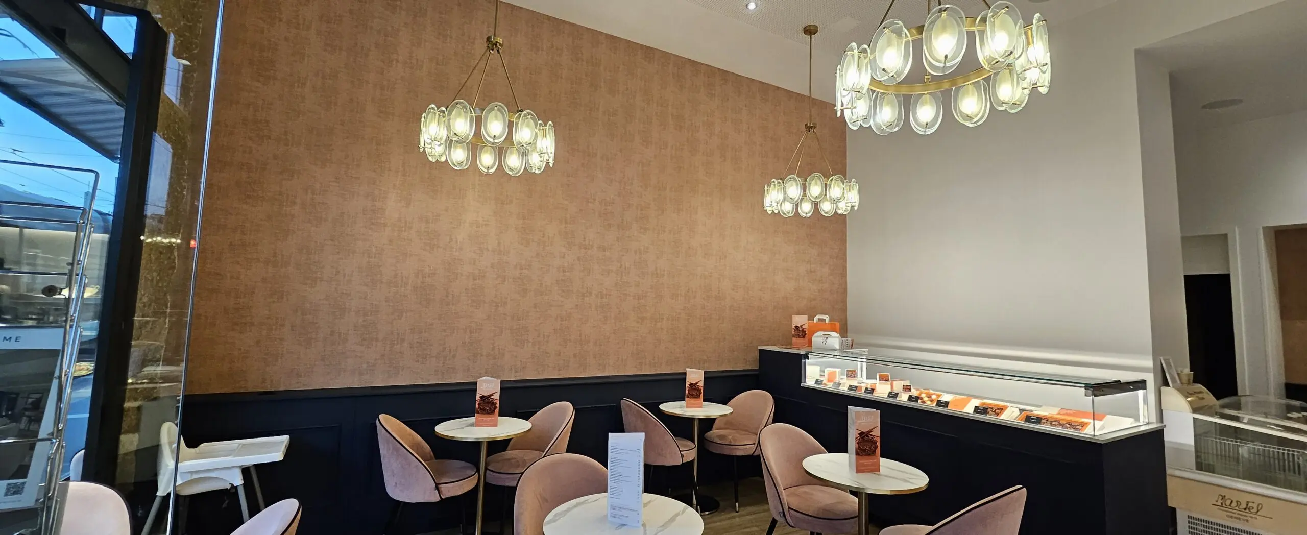 Pose d’un papier peint velours de la marque Casamance, dans une chocolaterie Martel.